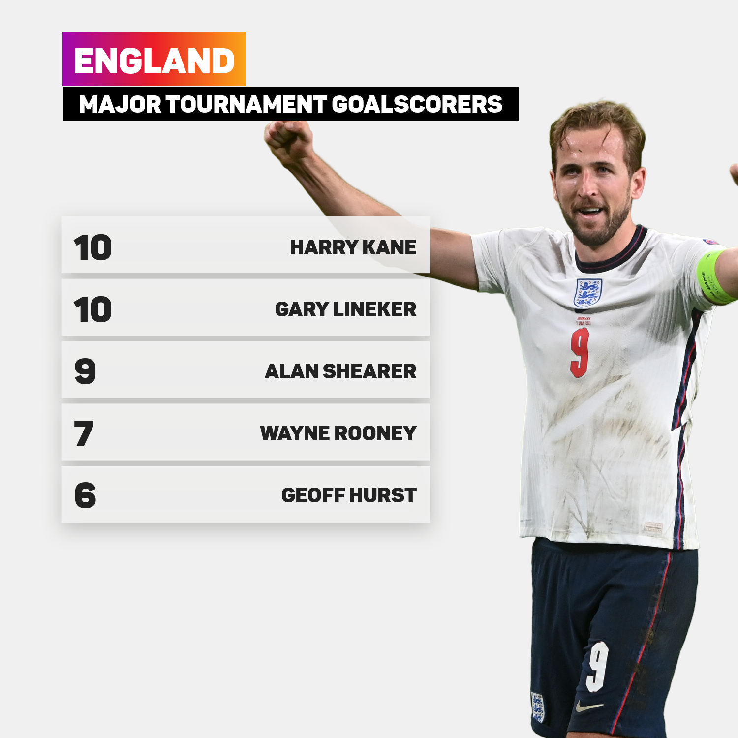 However, Kane finished the tournament with four goals – only Cristiano Ronaldo and Patrik Schick (five each) managed more – to draw level with Gary Lineker as his nation’s leading scorer at major tournaments.
